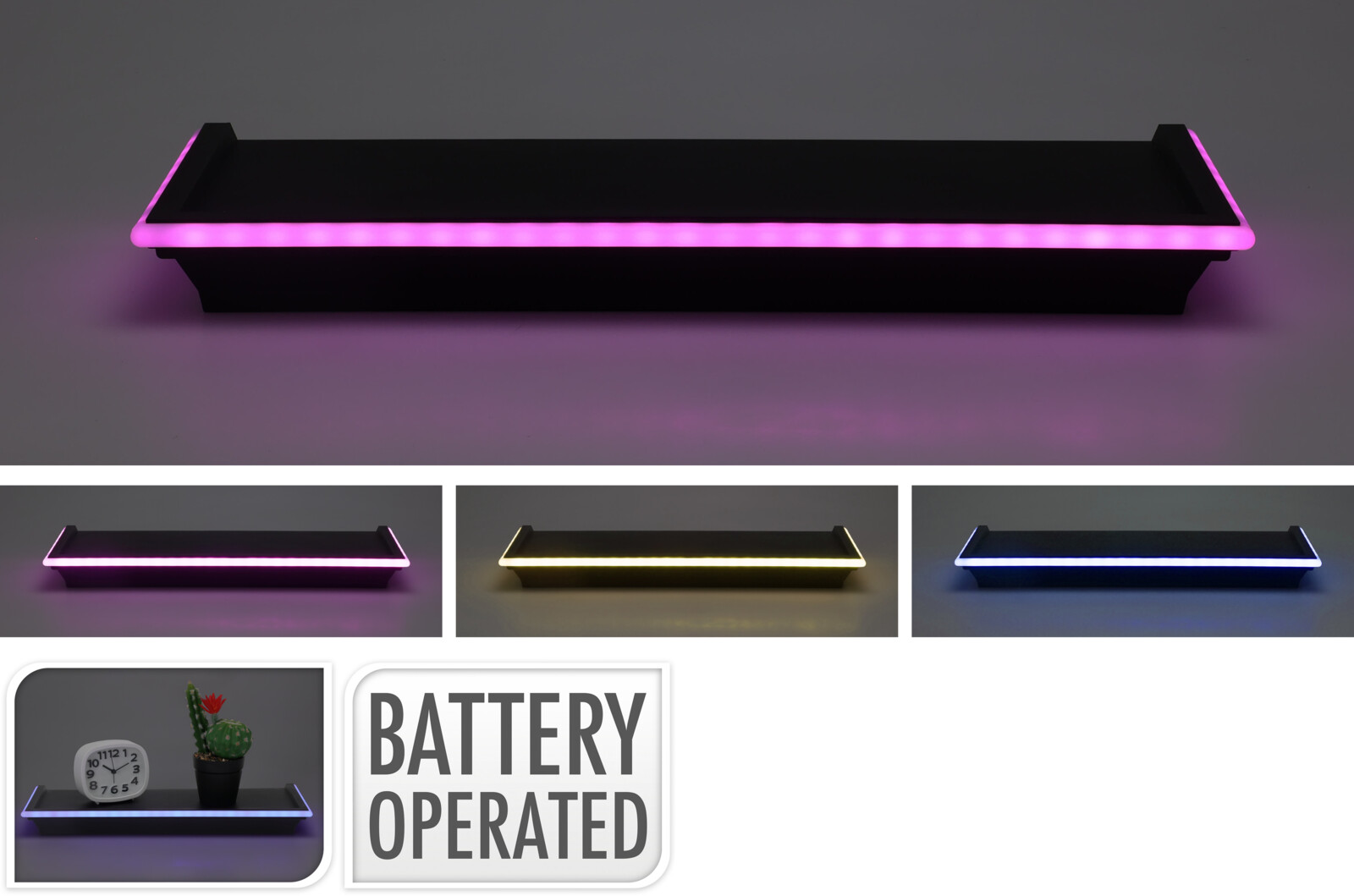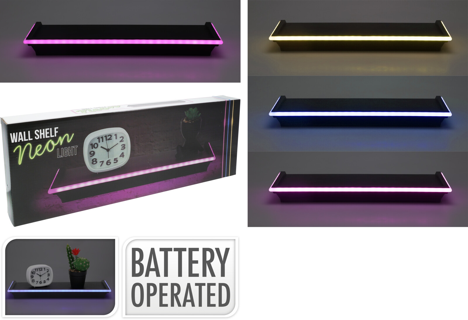 Wall Shelf With Led Neon Light, Size: 455X155X45Mm. 3 Assorted: Shelfs In Black With Pink, Blue Or Warm White Neon Light. Each Packed In Colorbox. Battery Operated 3X Aa Not Included, Ass.:3 Colours(Blck Pink Neon/Blck Blue Neon/Blck White Neon), Colorbox (Clb-S)/ 470X160X50Mm, Colorbox (Clb-S) / Cft 2,34,(15.542/40Ft Hq)